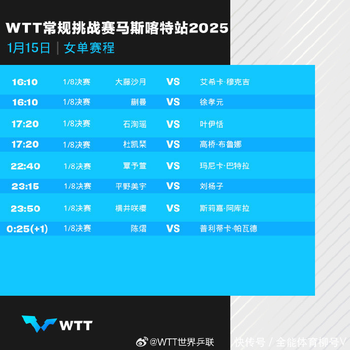 北京时间1月16日消息,2025年WTT常规挑战赛马斯喀特站继续进行。女子单打1/8决赛,中国女将表现非常出色,蒯曼、陈熠、石洵瑶、覃予萱继续强势晋级。其中,刚刚夺得多哈站女单冠军的蒯曼,以3-0战胜韩国选手徐孝元。世青赛冠军石洵瑶,则在上一轮以3-0战胜日本选手木原美悠。